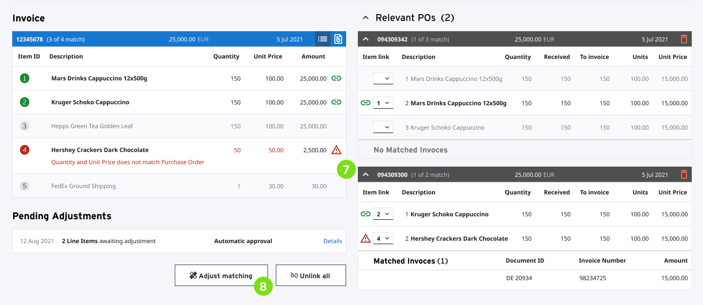 In some cases there may be exceptions where items on purchase order do not exactly match what is on the invoice. This can be caused by various factors like items partial delivery, different item description or quantity. User would be able to