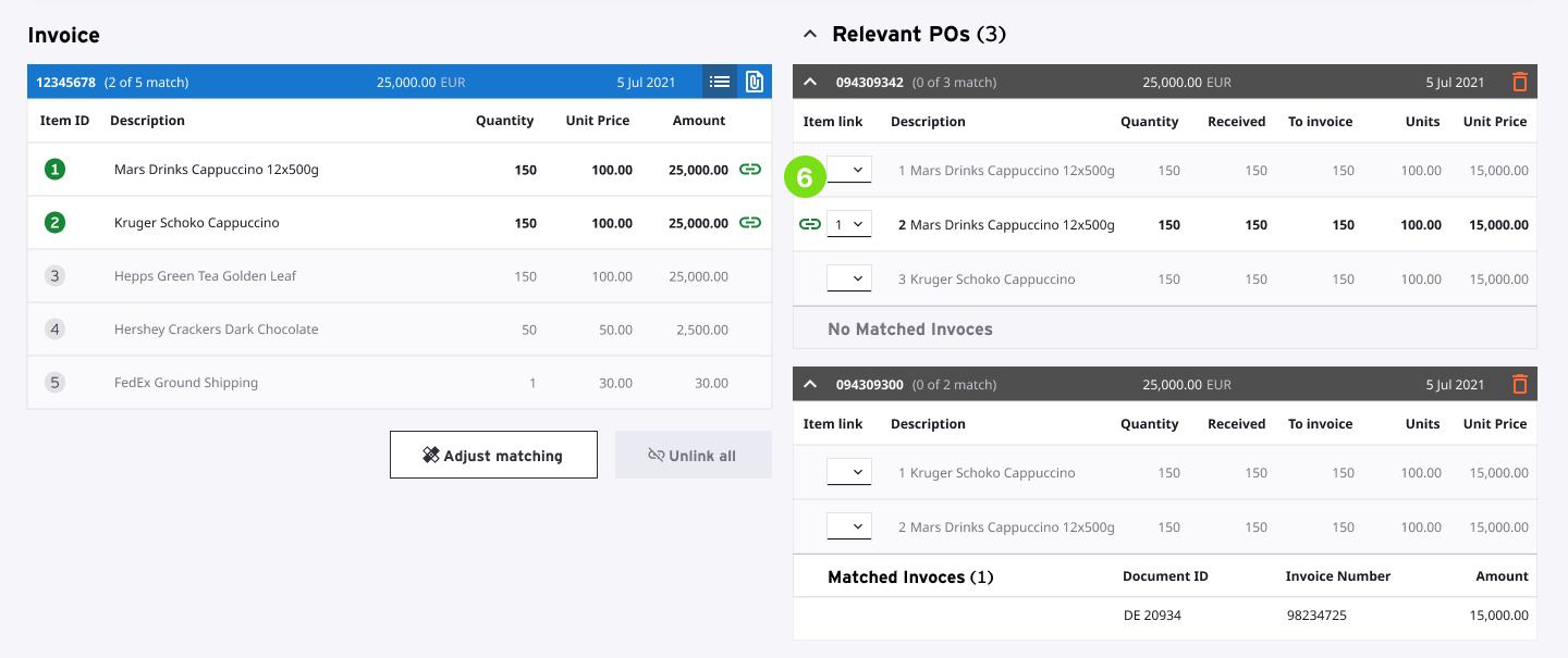 User will be able to select each item on purchase order and assign it to corresponding line item listed on the invoice. Once they make that selection, a link will be shown to indicate that connection has been made between two entities. If they want to change assignment, they could click on link icon to break the link or make another selection to make a new assignment.