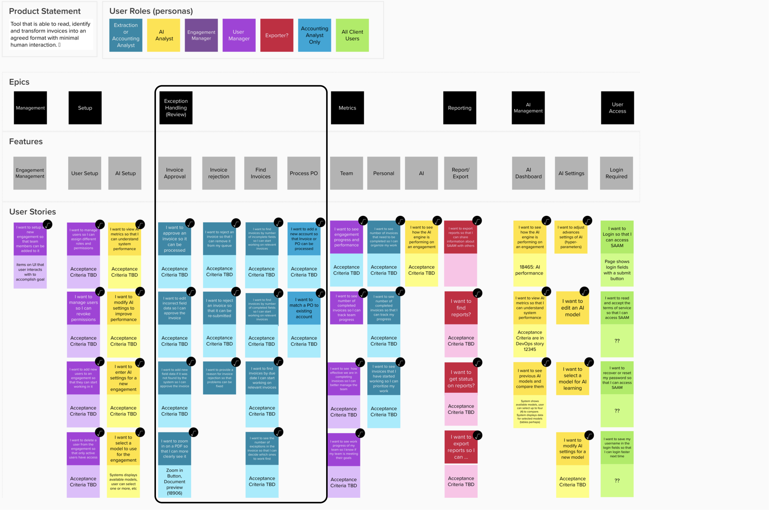 Invoice manager epic was part of a larger project. In order to dertermine scope of the project, we run a workshop with the team to ensure that we have captured all user stories. During these sessions we have aligned business requirements with user's needs and expectations.
