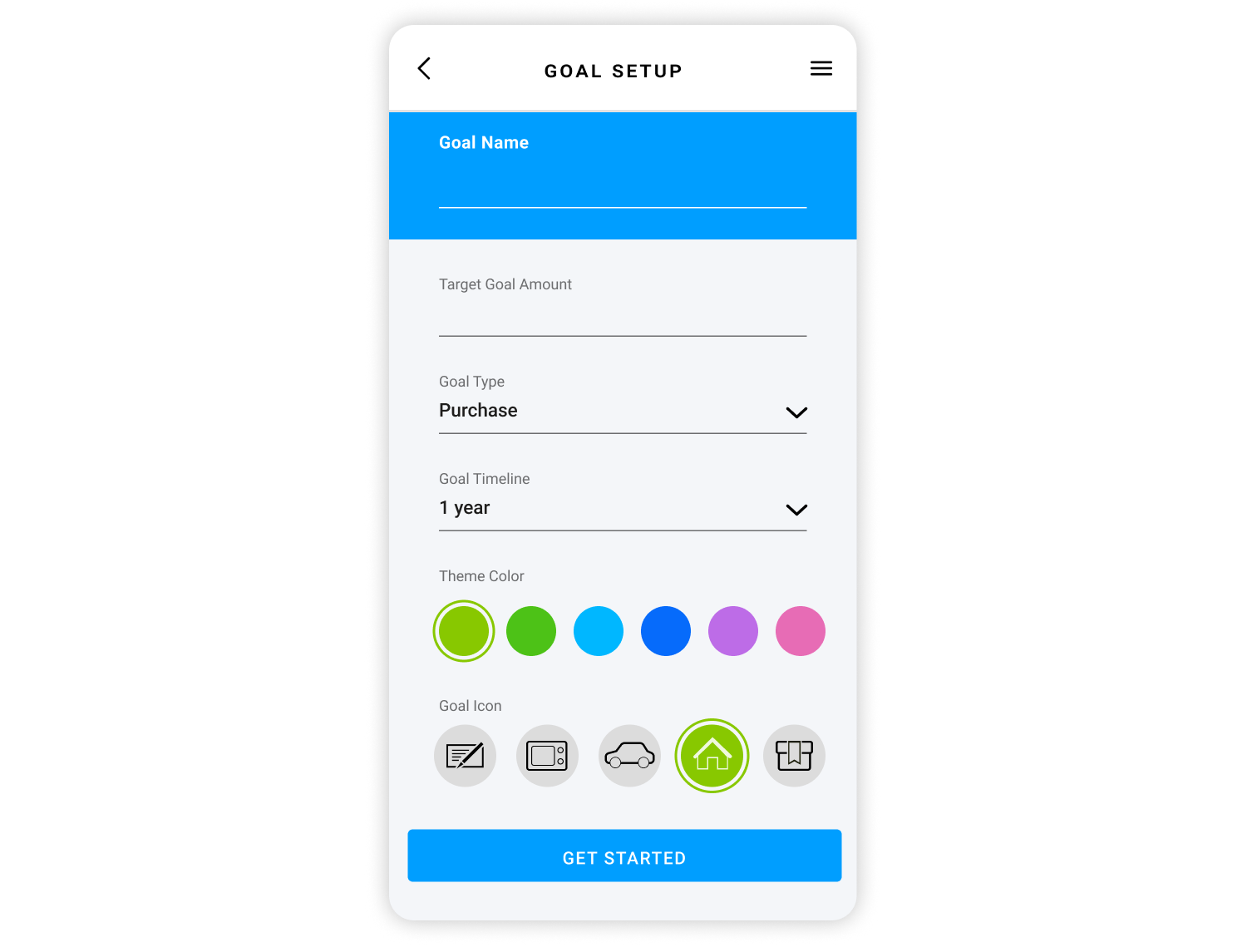 Once they choose a goal type, they will be able to customize it. They would be able to give goal a name and customize its look where each one would have a color and iconography that would be most relevant to the user. If user would have chosen a custom goal, there would be more options that would define what user is trying to achieve.