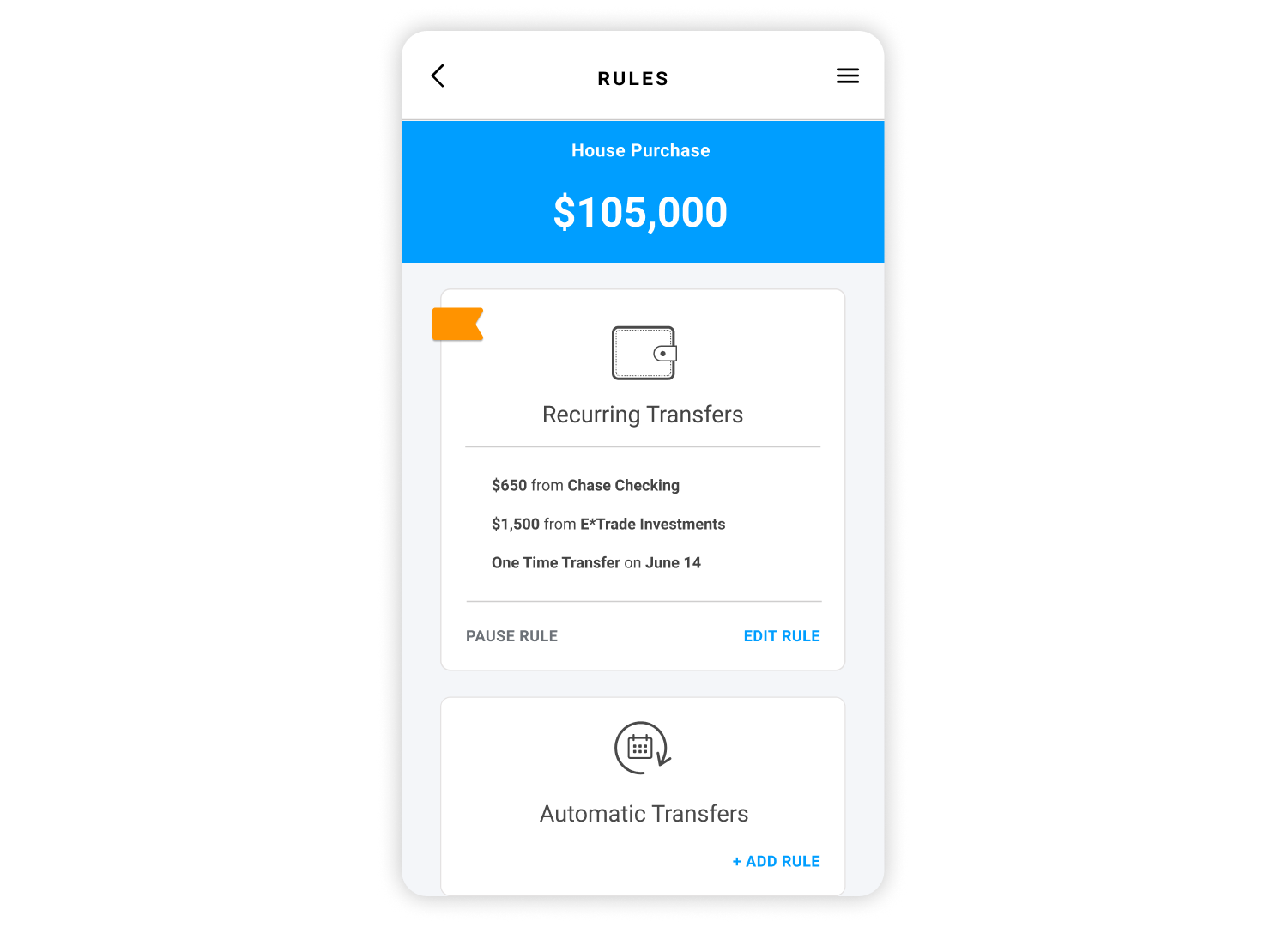 Based on initial goal setup, we would provide users with recommended set of rules that may work for them. We would consider goal amount and timeline provided to determine most realistic ways that would help user accomplish their goal. User would be able to edit recommended rules or add variety of rules to subsidize the fund.
