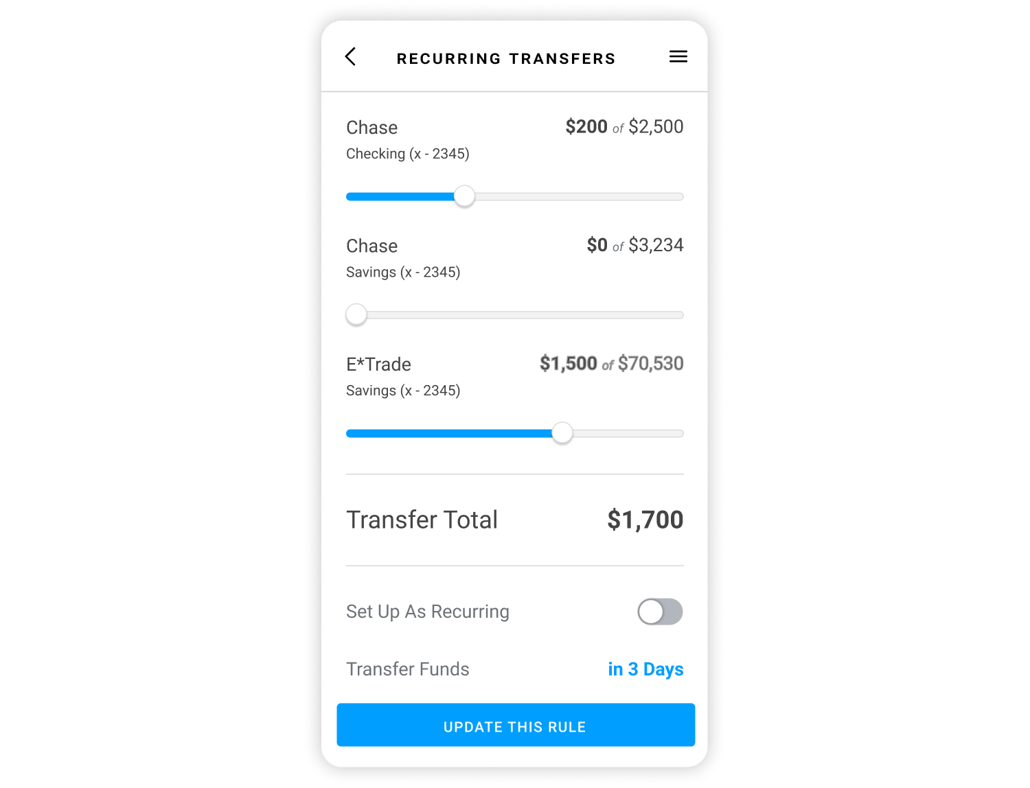 Because Save for Goal feature was part of larger suite of services, we would have access to all account that user has linked up. We would be able to determine based on account balances and spending patterns to decide of what would be best contribution they could make in order to fund their goal with as little impact on their livelihood as possible.