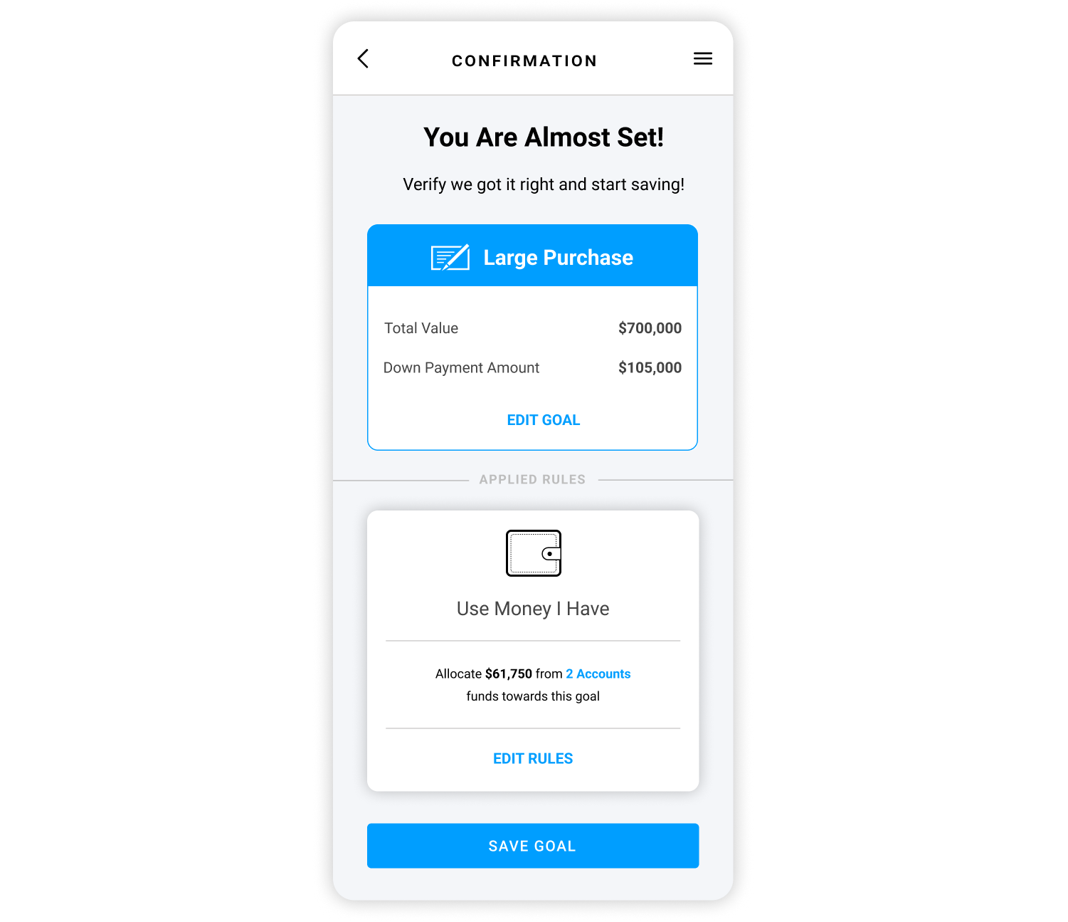 After all rules are set up, we would ensure that everything adds up and we would provide adjusted funding for the goal. They would be able to review all the changes and see preview the setup. User would be able to adjust their goal settings at any time if they feel that rules are either too aggressive or it, they'd like to update rules in order to achieve their goal faster.