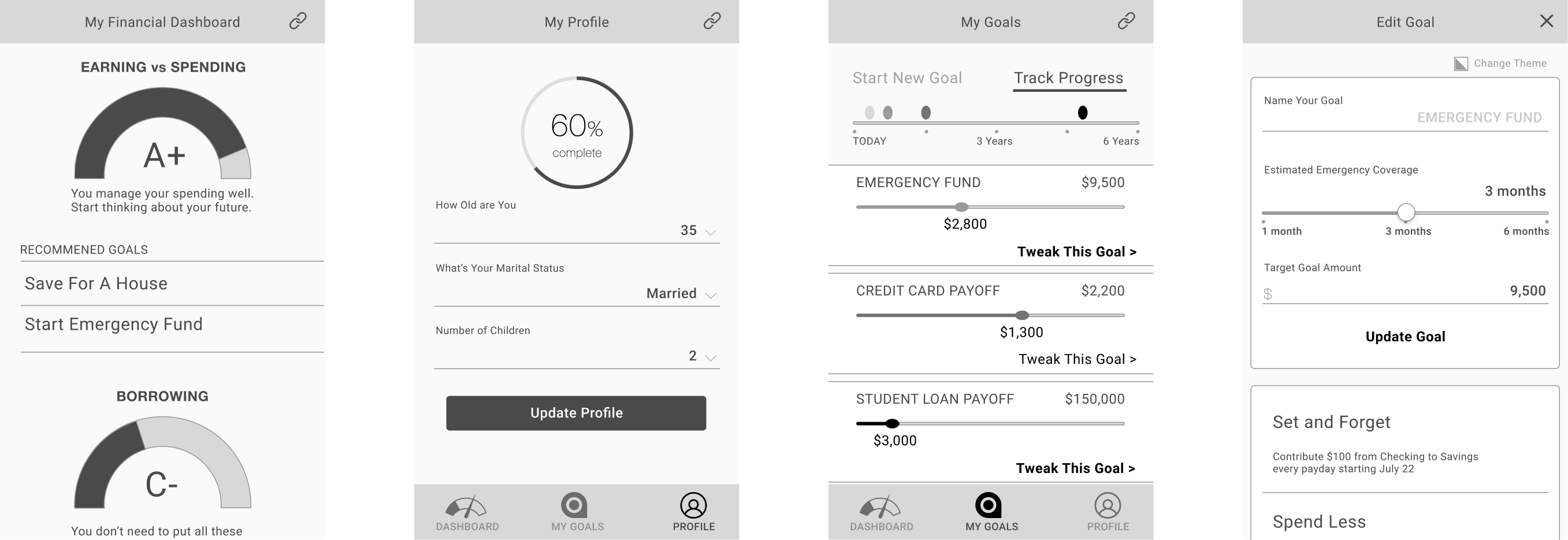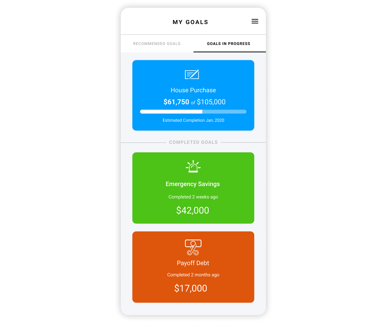 Once goal is completed, it will be shown on goals in progress panel along with other goals they might've set up or have completed in the past. User would be able to track their progress towards the completion and see if they would like to make any changes.