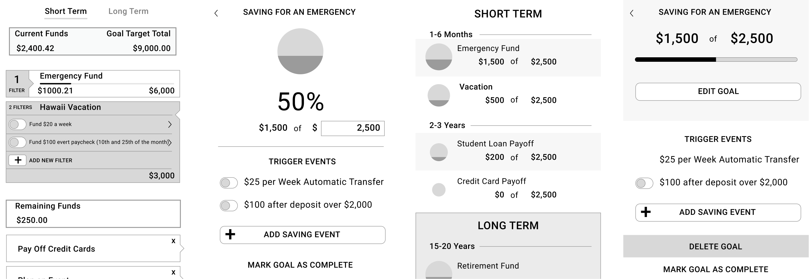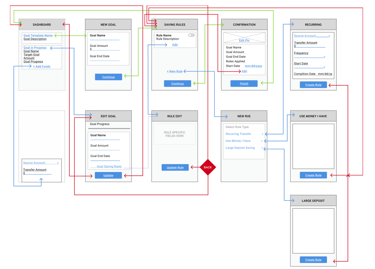 The primary benefit of the application was to provide users ability to save for an emergency, large purchase or events. Users can save for multiple goals in a single account, or for a single goal across multiple accounts. The app allows the set up of goals and keeps track of progress. I created the user flow wireframes to help the team understand the end-to-end scope of creating, editing, and tracking goal progress.